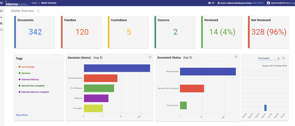 Working closely with our clients Informa manage the process of creating an end-to-end solution where search is extensive (connected sources) and consistent (structured search) with audit so the effort is the same and the reliance on others is reduced. With instant access to numbers/counts scope can be negotiated with the requester or at minimum you know the extent of the issue should an extension of time be required.